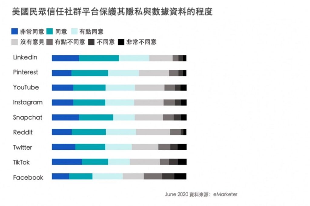 根據 eMarketer 2020 年 5 月的評估報告指出,對於美國民眾來說,在常用的社群平台當中 Facebook 的信任程度排名為倒數最後,雖然社群用戶數仍在成長中,但顯然曾經是社群龍頭的平台也產生了變化。