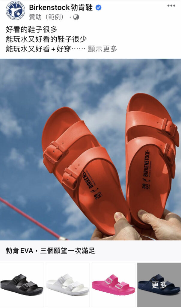 從企業平臺設定的廣告有非常多樣的呈現方式,包含單圖貼文、多圖貼文、商品陳列、短影片製作等等,可以參考下列截圖。