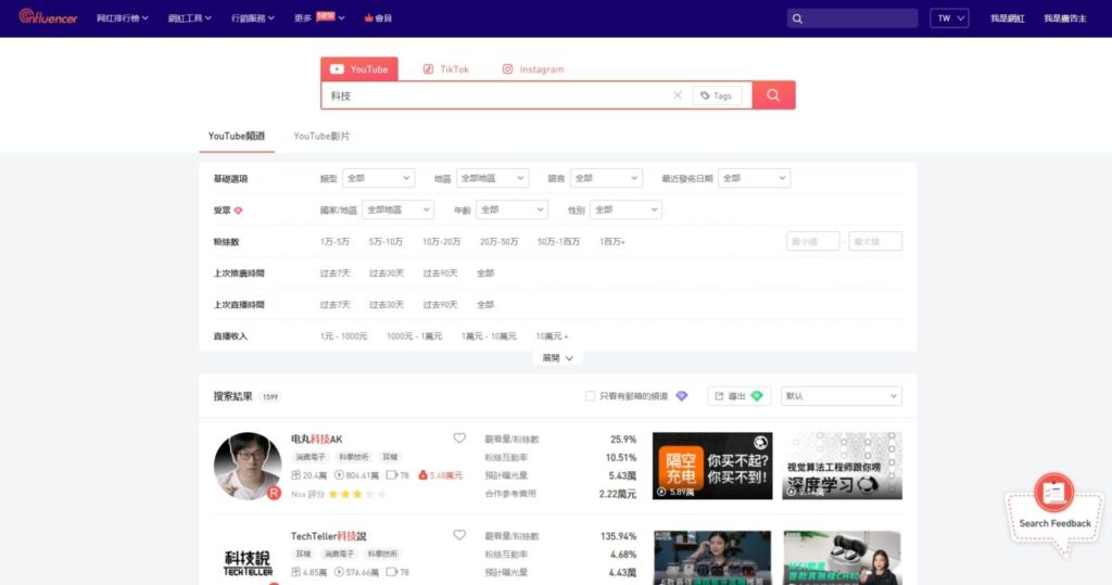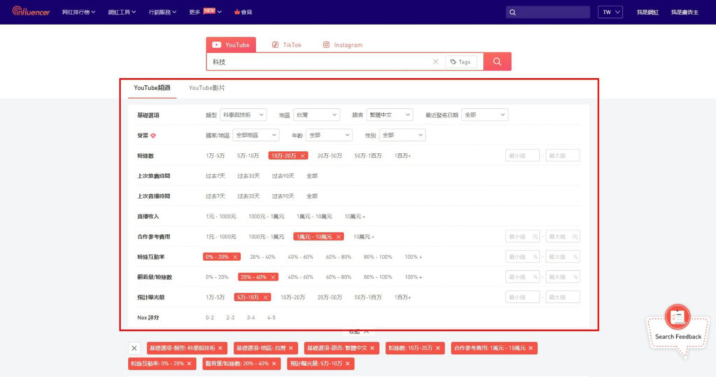 而若你是屬於沒有頭緒的階段時,Noxinfluencer 亦可以提供幫助。以電腦品牌為例,我們可以試著以相關關鍵字 —「科技」來搜尋,下方就會出現與此字詞有關的頻道,而要是對於初次產生的名單不滿意,則可以再次利用上方的選項表單來進一步篩選,不管是地區、受眾、粉絲數、互動率、曝光量,甚至是合作費用(參考)都可以鎖定喔!