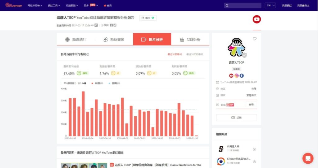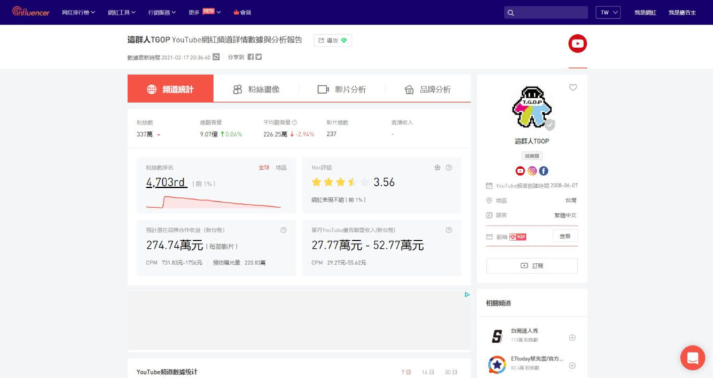 至於已有確定人選的使用者,則可直接在首頁的搜尋欄中輸入人選名稱,就能獲得「網紅頻道詳情數據與分析報告」,這份報告中包含了頻道統計、粉絲畫像、影片分析及品牌分析四大類,每個項目之下又有許多細項資訊,能夠幫助你更謹慎地檢視人選,不過需要注意的是,粉絲畫像和品牌分析的內容需要成為會員才能夠查看。