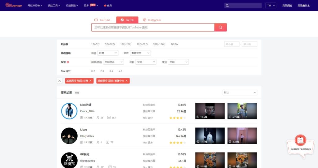 Noxinfluencer 首頁,大大的搜尋欄左側即可以馬上進行平台選擇,你能夠依照你的需求來搜尋特定平台上的網紅 KOL,假設你今天要找的是一名 Youtuber,你就可以直接切換到 YouTube 的分類來檢索,並在搜尋欄中打入網紅 KOL 的名稱或者「任意關鍵字」(比如,網紅的類型、形象或領域等),系統便會跑出相關的人選名單給你。而 Noxinfluencer 與其他分析工具最不一樣地方,則是它還提供 TikTok 的搜尋,而且提供的資訊一樣完整豐富,可說是絕無僅有、只此一家,如果要與TikTok 的網紅合作的話,一定要來這個網站逛逛!