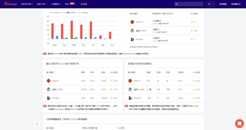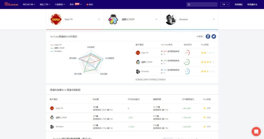 另外,還有一個非常實用的功能是「頻道對比分析報告」,你可以將心目中理想的幾個人選,藉由此功能來深入權衡個別網紅 KOL 合作的優勢與劣勢。在此報表中,可以看到頻道的粉絲變化 & 成長軌跡、歷史數據、全球排名、近期影片表現分析、粉絲互動情形及社群媒體豐富度。對於正在猶豫不決的你,這個功能肯定可以幫上大忙!
