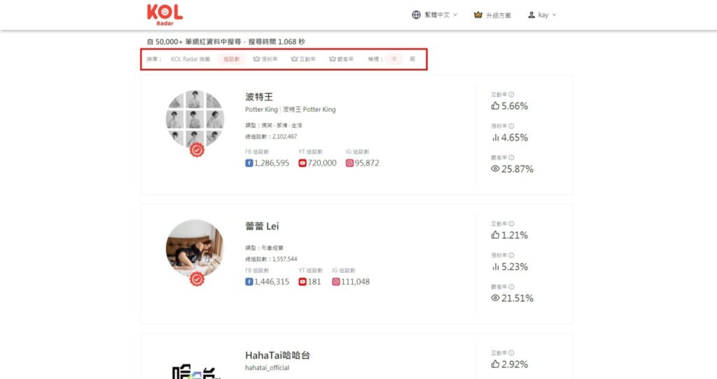 目前頁面僅提供非常直覺的5種排序方法(系統推薦、追蹤數、漲粉率、互動率、觀看率),資料來源主要為Facebook、YouTube、Instagram名單。