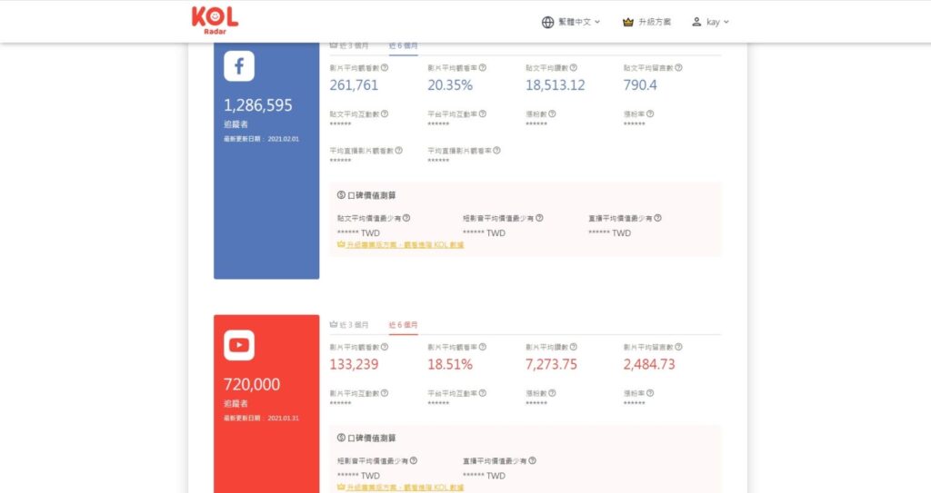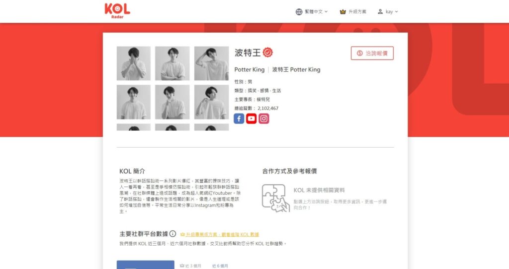 點進列表中的名單後,就可以了解更多此網紅 KOL 的相關資訊。這邊最方便的是,系統會幫你統整這位網紅 KOL 所有經營的平台,並全部顯示在一個頁面中,這便於我們快速比較網紅 KOL 在不同平台中的表現優劣。