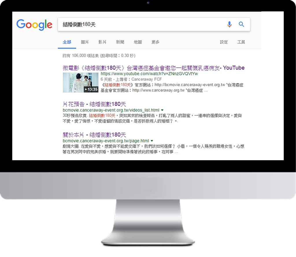 - 關鍵字廣告:透過關鍵字廣告接觸搜尋相關議題的民眾,提高影片、議題觸及量。導向官方活動網站更多認識如何預防、治療乳癌相關知識。