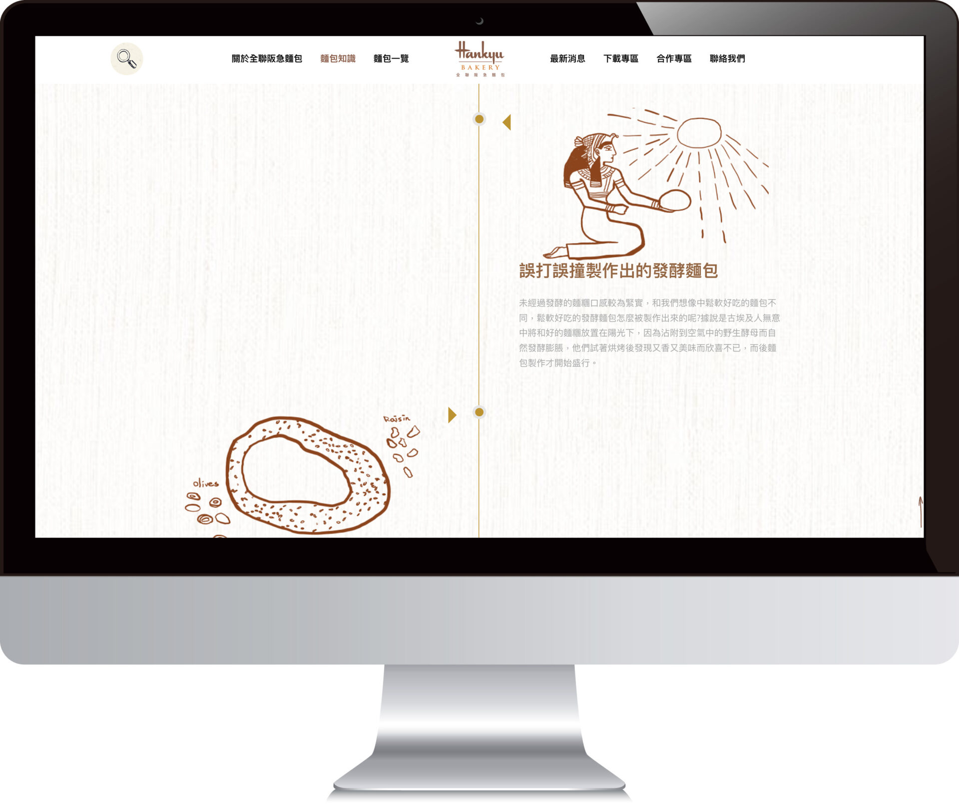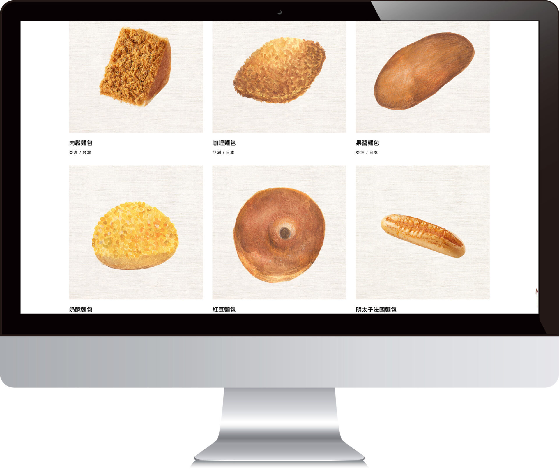 與台灣插畫家合作,繪製麵包手繪小圖,穿插於網站頁面中,使讀者在瀏覽的過程能感受品牌溫暖、細膩的小巧思。
