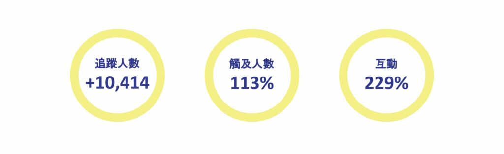 本社群為從零開始的操作,社群營運期間,成功爭取高於原定目標的曝光、觸及與互動表現,社群曝光達成率168%、觸及人數達成率113%、互動次數達成率229%,並在一年的時間內帶來了10,414個追蹤數。
