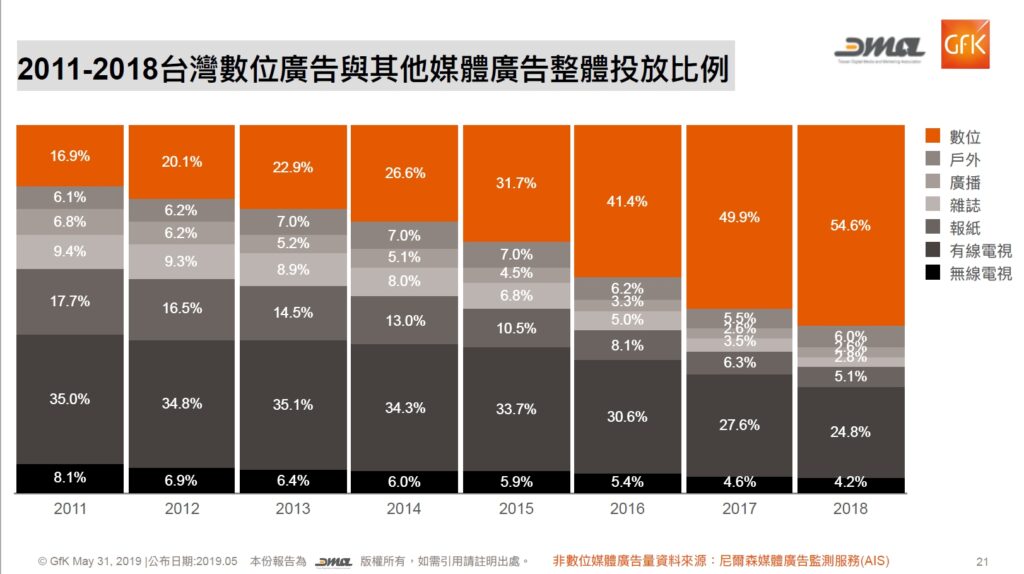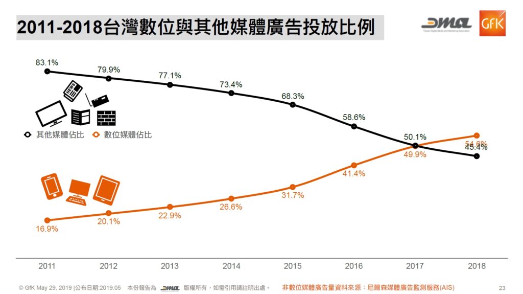根據尼爾森媒體廣告監測服務及 DMA 調查報告,可以看出數位廣告與傳統廣告之比例差異變化情形。從 2011 開始,數位行銷的佔比持續提升,且成長比率仍逐年增成長。2017 年,數位行銷與傳統行銷投放比例就已經來到交叉點,由此可見,此後兩者間的差距將會持續且快速地擴大。