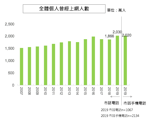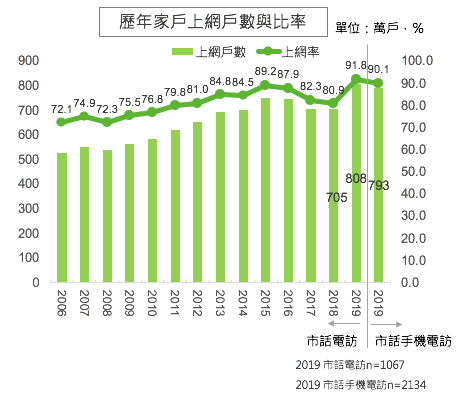 根據網路資訊中心 2019 年的調查報告指出,全國 12 歲以上上網人數達 1,898 萬人,而全國上網人數經已高達 2,000 萬人,整體上網率達 85.6%;家戶上網部分,推估全國家庭上網有 793 萬戶,全國家戶上網比例達 90.1%;主要上網方式為寬頻上網,比例高達 89.3%。 調查顯示 12 歲以上個人曾經上網率今年達到 89.6%,為歷年最高,推估全國上網人數也是首次突破兩千萬人,上網率增加較多的年齡層為 55 歲以上族群,共增加兩成。